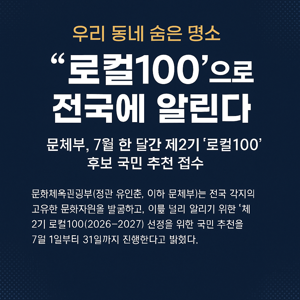 문화체육관광부(장관 유인촌, 이하 문체부)는 7월 1일부터 31일까지 전국민을 대상으로 ‘제2기 로컬100(2026~2027)’ 후보를 추천받는다고 밝혔다. 이번 사업은 지역의 숨은 문화자원을 발굴하고 대한민국 대표 문화 콘텐츠로 육성하기 위한 국민 참여형 프로젝트다.